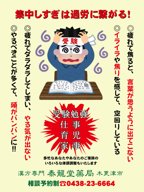 勉強や仕事のし過ぎで疲れてダラダラしてしまうのは「気の不足」ですので、睡眠や栄養を十分に摂った上で、気を補充する漢方薬を用いると速やかに回復することが多いようです。